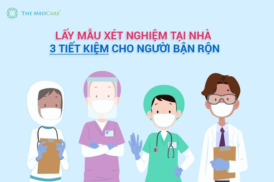 - Lấy mẫu xét nghiệm tại nhà: khách hành chỉ việc đặt lịch và chúng tôi sẽ có nhân viên đến lấy mẫu, chỉ một gian ngắn khách hàng nhận kết quả qua các hình thức: qua APP, qua WEBSITE, qua tin nhắn SMS. Song song đó nếu kết quả có bất thường chúng tôi có thể tư vấn hoặc cho thuốc ONLINE cho khách hàng